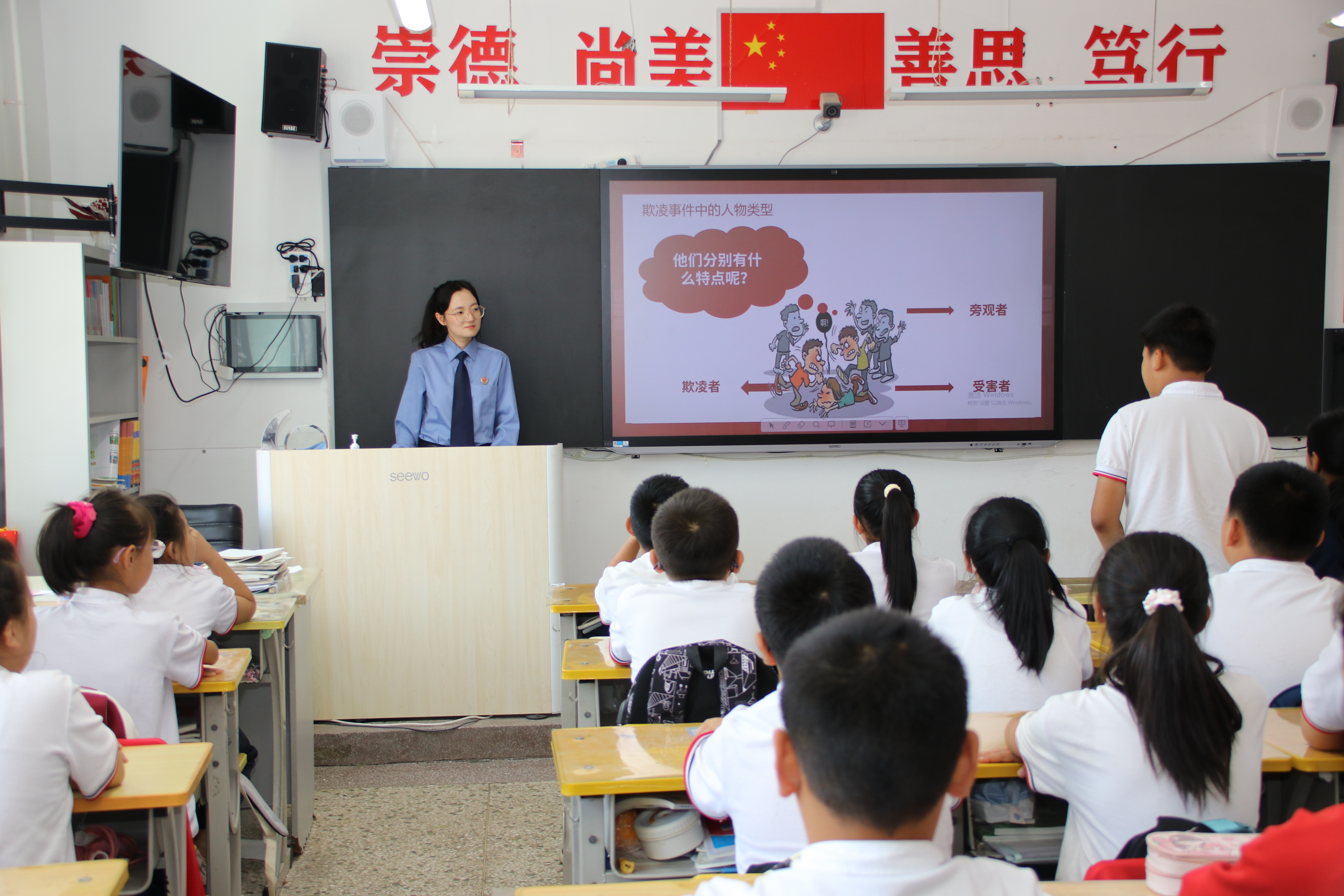 检察官将校园欺凌拆分为施暴者、被欺凌者和旁观者三个视角,让同学们探讨他们分别具有什么特点和心理活动。